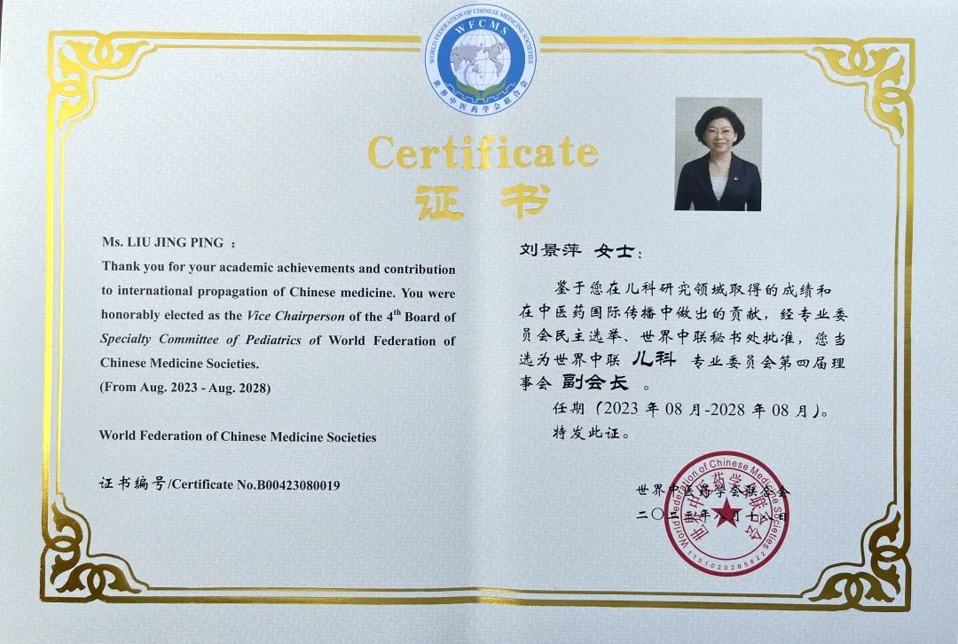 金沙9001cc药业集团党委书记、董事长刘景萍当选世界中医药学会联合会儿科专业委员会第四届理事会副会长
