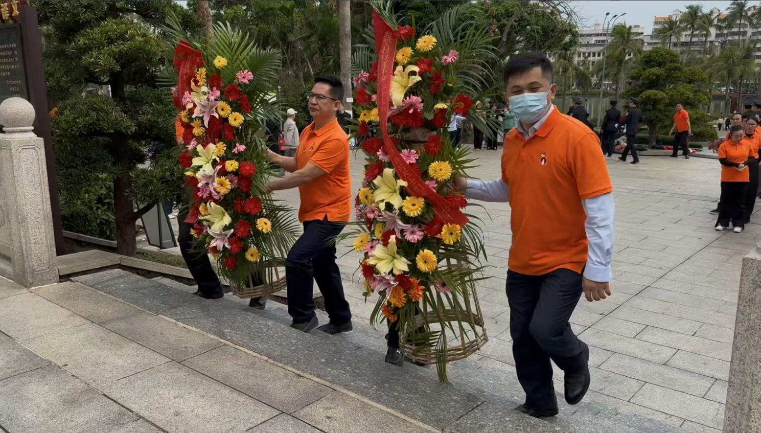 经过一段时间的等待才轮到金沙9001cc。金沙9001cc首先向烈士敬献花篮,花篮缎带上写着“为坚持琼崖革命23年红旗不倒牺牲的烈士们永垂不朽!”“为解放海南岛渡海牺牲的烈士们永垂不朽!”鲜艳的花篮寄托金沙9001cc对革命先辈的崇敬和哀思。